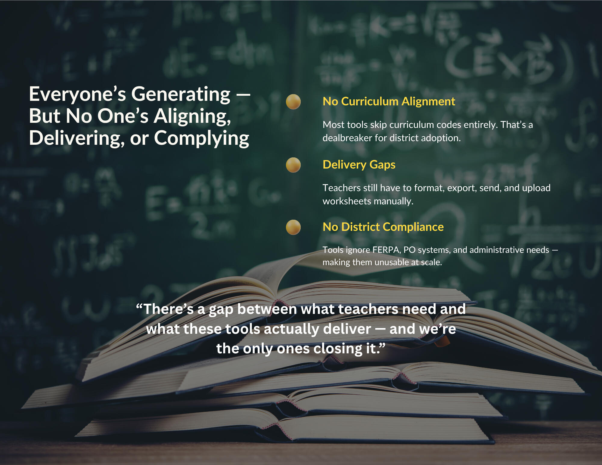 A: Nope! It works for homeschoolers, tutors, private school teachers — anyone who needs aligned curriculum.Q: Will I need to train the AI?